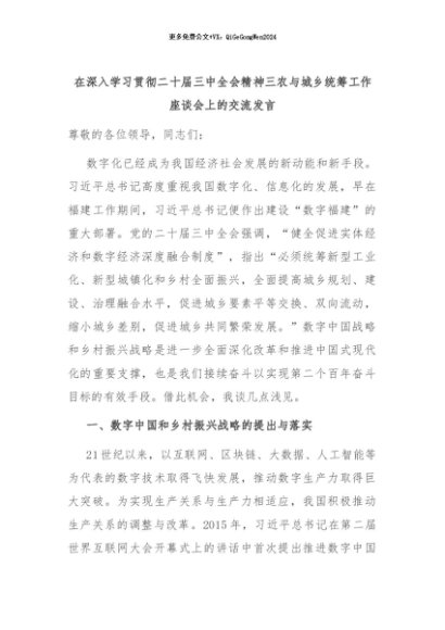 【七哥公文】2024年:在深入学习贯彻二十届三中全会精神三农与城乡统筹工作座谈会上的交流发言+更多免费公文+VX:QiGeGongWen2024
