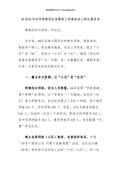 【七哥公文】2024年:在2024年全市网格员队伍建设工作座谈会上的汇报发言+更多免费公文+VX:QiGeGongWen2024
