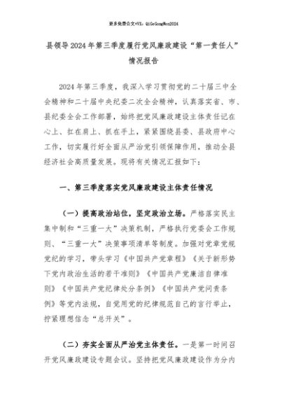 【七哥公文】2024年:县领导2024年第三季度履行党风廉政建设“第一责任人”情况报告+更多免费公文+VX:QiGeGongWen2024