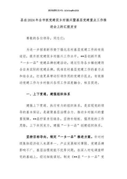 【七哥公文】2024年:县在2024年全市抓党建促乡村振兴暨基层党建重点工作推进会上的汇报发言+更多免费公文+VX:QiGeGongWen2024