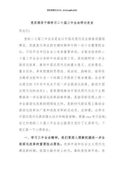 / 【七哥公文】2024年:党员领导干部学习二十届三中全会研讨发言+更多免费公文+VX:QiGeGongWen2024
