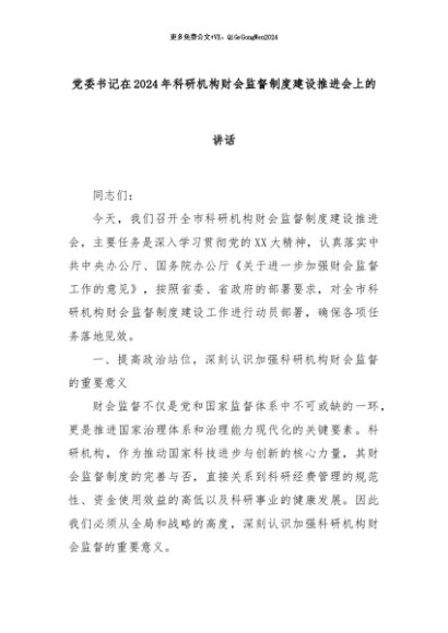 【七哥公文】2024年:党委书记在2024年科研机构财会监督制度建设推进会上的讲话+更多免费公文+VX:QiGeGongWen2024