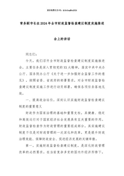 【七哥公文】2024年:常务副市长在2024年全市财政监督检查建议制度实施推进会上的讲话+更多免费公文+VX:QiGeGongWen2024