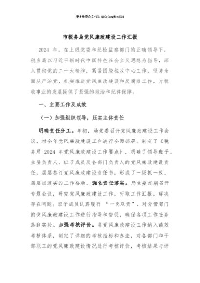 / 【七哥公文】2024年:市税务局党风廉政建设工作汇报+更多免费公文+VX:QiGeGongWen2024
