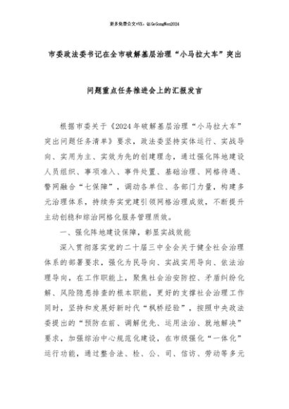 【七哥公文】2024年:市委政法委书记在全市破解基层治理“小马拉大车”突出问题重点任务推进会上的汇报发言+更多免费公文+VX:QiGeGongWen2024