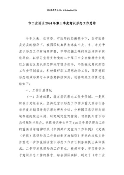 / 【七哥公文】2024年:市工业园区2024年第三季度意识形态工作总结+更多免费公文+VX:QiGeGongWen2024