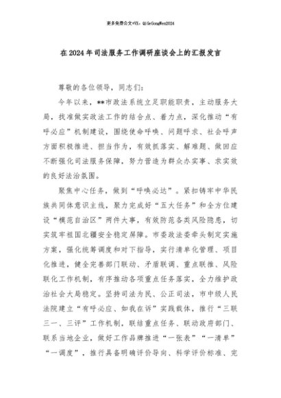 / 【七哥公文】2024年:在2024年司法服务工作调研座谈会上的汇报发言+更多免费公文+VX:QiGeGongWen2024