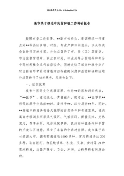 / 【七哥公文】2024年:某市关于推进中药材种植工作调研报告+更多免费公文+VX:QiGeGongWen2024