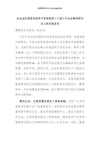 【七哥公文】2024年:在自治区团委系统学习贯彻党的二十届三中全会精神研讨会上的交流发言+更多免费公文+VX:QiGeGongWen2024