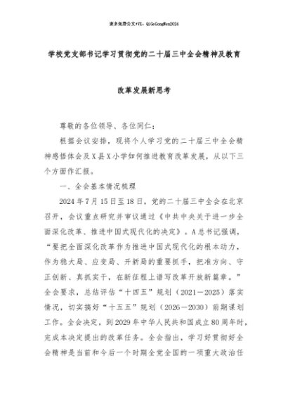 【七哥公文】2024年:学校党支部书记学习贯彻党的二十届三中全会精神及教育改革发展新思考+更多免费公文+VX:QiGeGongWen2024