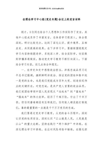 / 【七哥公文】2024年:在理论学习中心组(党史专题)会议上的发言材料+更多免费公文+VX:QiGeGongWen2024