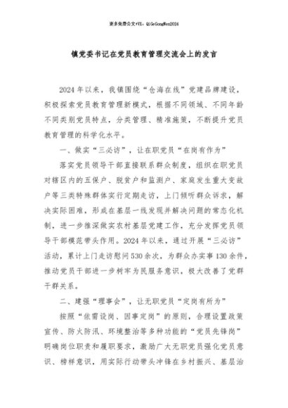 / 【七哥公文】2024年:镇党委书记在党员教育管理交流会上的发言+更多免费公文+VX:QiGeGongWen2024