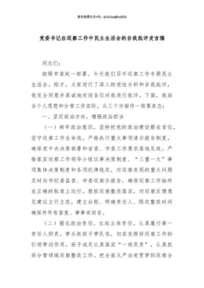 / 【七哥公文】2024年:党委书记在巡察工作中民主生活会的自我批评发言稿+更多免费公文+VX:QiGeGongWen2024