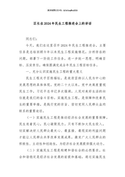 / 【七哥公文】2024年:区长在2024年民生工程推进会上的讲话+更多免费公文+VX:QiGeGongWen2024