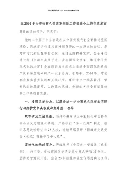 【七哥公文】2024年:在2024年全市检察机关改革创新工作推进会上的交流发言+更多免费公文+VX:QiGeGongWen2024