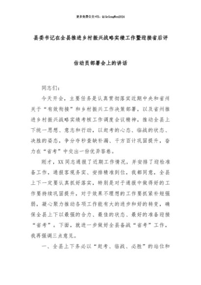 【七哥公文】2024年:县委书记在全县推进乡村振兴战略实绩工作暨迎接省后评估动员部署会上的讲话+更多免费公文+VX:QiGeGongWen2024