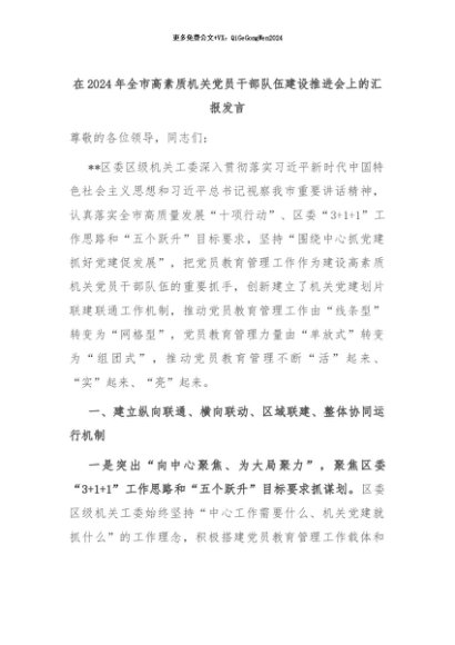 【七哥公文】2024年:在2024年全市高素质机关党员干部队伍建设推进会上的汇报发言+更多免费公文+VX:QiGeGongWen2024