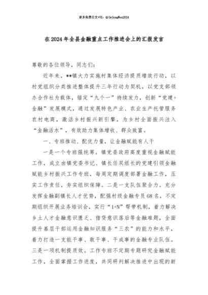 / 【七哥公文】2024年:在2024年全县金融重点工作推进会上的汇报发言+更多免费公文+VX:QiGeGongWen2024