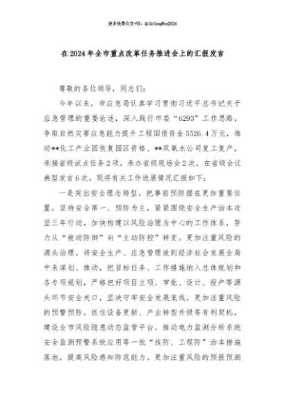 / 【七哥公文】2024年:在2024年全市重点改革任务推进会上的汇报发言+更多免费公文+VX:QiGeGongWen2024