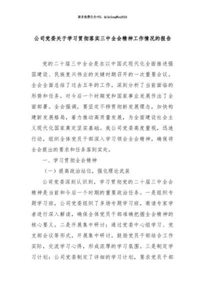 【七哥公文】2024年:公司党委关于学习贯彻落实三中全会精神工作情况的报告+更多免费公文+VX:QiGeGongWen2024