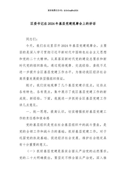 / 【七哥公文】2024年:区委书记在2024年基层党建观摩会上的讲话+更多免费公文+VX:QiGeGongWen2024