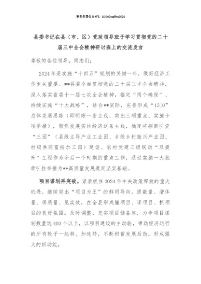 【七哥公文】2024年:县委书记在县(市、区)党政领导班子学习贯彻党的二十届三中全会精神研讨班上的交流发言+更多免费公文+VX:QiGeGongWen2024