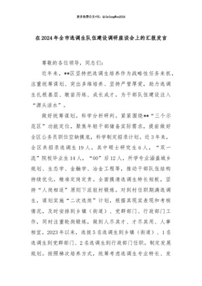 【七哥公文】2024年:在2024年全市选调生队伍建设调研座谈会上的汇报发言+更多免费公文+VX:QiGeGongWen2024