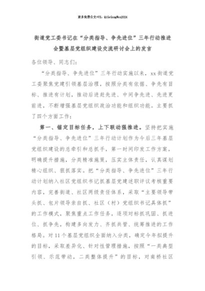 【七哥公文】2024年:街道党工委书记在“分类指导、争先进位”三年行动推进会暨基层党组织建设交流研讨会上的发言+更多免费公文+VX:QiGeGongWen2024