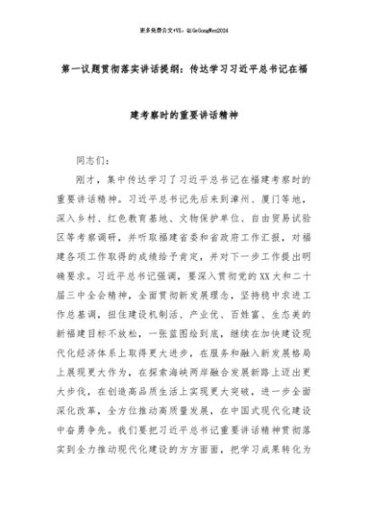【七哥公文】2024年:第一议题贯彻落实讲话提纲:传达学习习近平总书记在福建考察时的重要讲话精神+更多免费公文+VX:QiGeGongWen2024