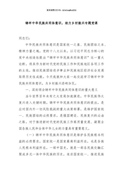 / 【七哥公文】2024年:铸牢中华民族共同体意识,助力乡村振兴专题党课+更多免费公文+VX:QiGeGongWen2024