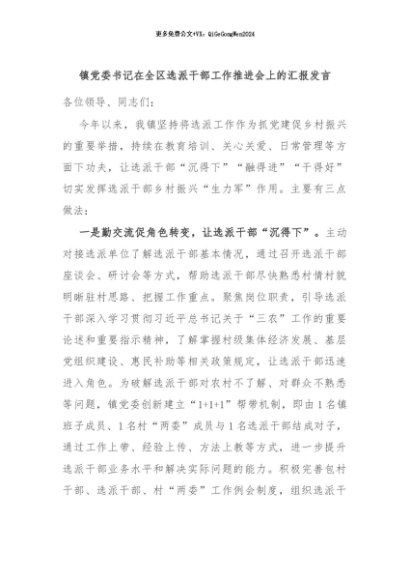 / 【七哥公文】2024年:镇党委书记在全区选派干部工作推进会上的汇报发言+更多免费公文+VX:QiGeGongWen2024