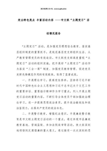 【七哥公文】2024年:突出特色亮点 丰富活动内容 ——市文联“主题党日”活动情况报告+更多免费公文+VX:QiGeGongWen2024