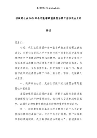 【七哥公文】2024年:组织部长在2024年全市数字赋能基层治理工作推进会上的讲话+更多免费公文+VX:QiGeGongWen2024