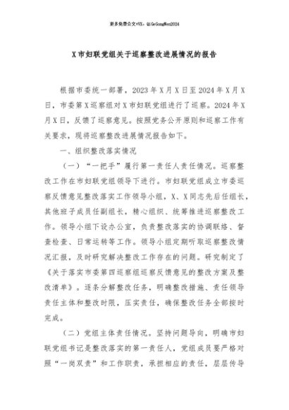/ 【七哥公文】2024年:X市妇联党组关于巡察整改进展情况的报告+更多免费公文+VX:QiGeGongWen2024