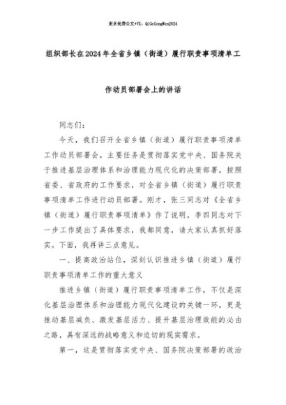 【七哥公文】2024年:组织部长在2024年全省乡镇(街道)履行职责事项清单工作动员部署会上的讲话+更多免费公文+VX:QiGeGongWen2024