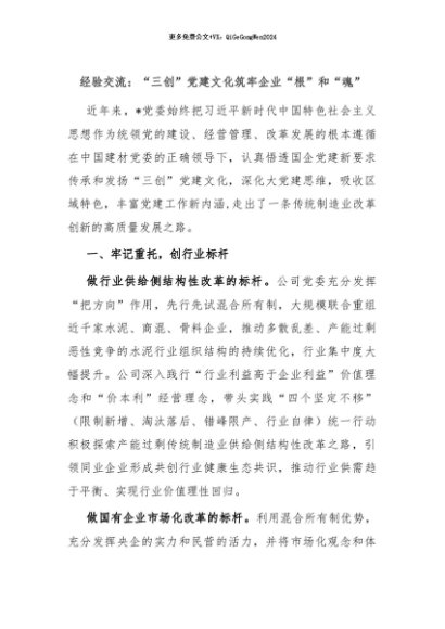 / 【七哥公文】2024年:经验交流:“三创”党建文化筑牢企业“根”和“魂”+更多免费公文+VX:QiGeGongWen2024