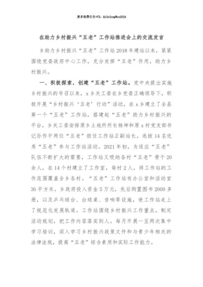 / 【七哥公文】2024年:在助力乡村振兴“五老”工作站推进会上的交流发言+更多免费公文+VX:QiGeGongWen2024