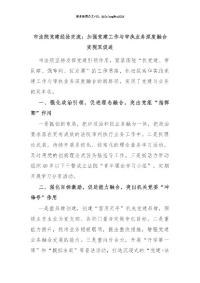 【七哥公文】2024年:市法院党建经验交流:加强党建工作与审执业务深度融合实现双促进+更多免费公文+VX:QiGeGongWen2024