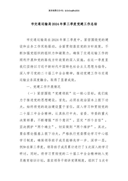 / 【七哥公文】2024年:市交通运输局2024年第三季度党建工作总结+更多免费公文+VX:QiGeGongWen2024