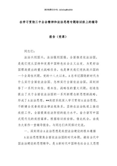 【七哥公文】2024年:在学习贯彻三中全会精神和法治思想专题培训班上的辅导报告(党课)+更多免费公文+VX:QiGeGongWen2024