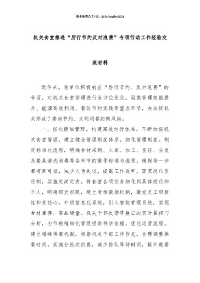【七哥公文】2024年:机关食堂推进“厉行节约反对浪费”专项行动工作经验交流材料+更多免费公文+VX:QiGeGongWen2024