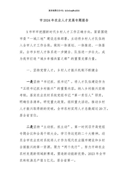 / 【七哥公文】2024年:市2024年农业人才发展专题报告+更多免费公文+VX:QiGeGongWen2024