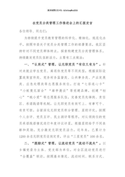 / 【七哥公文】2024年:在党员分类管理工作推进会上的汇报发言+更多免费公文+VX:QiGeGongWen2024