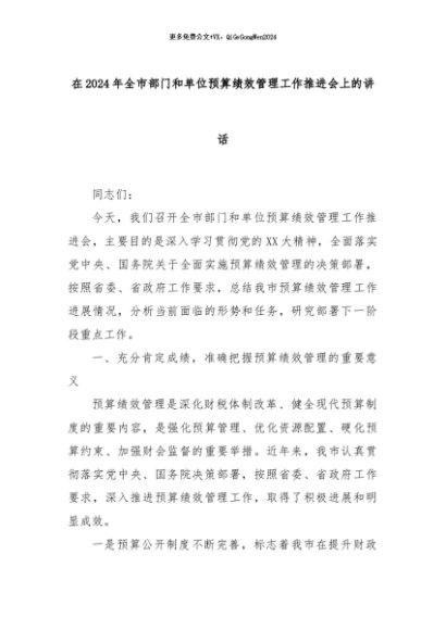 【七哥公文】2024年:在2024年全市部门和单位预算绩效管理工作推进会上的讲话+更多免费公文+VX:QiGeGongWen2024