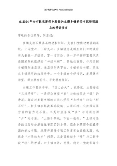 【七哥公文】2024年:在2024年全市抓党建促乡村振兴主题乡镇党委书记培训班上的研讨发言+更多免费公文+VX:QiGeGongWen2024