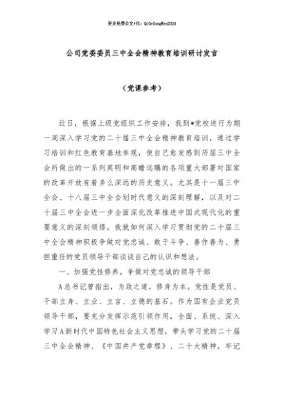 【七哥公文】2024年:公司党委委员三中全会精神教育培训研讨发言(党课参考)+更多免费公文+VX:QiGeGongWen2024