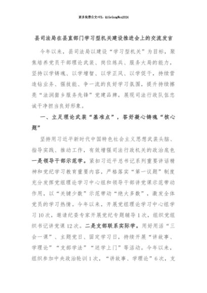 【七哥公文】2024年:县司法局在县直部门学习型机关建设推进会上的交流发言+更多免费公文+VX:QiGeGongWen2024
