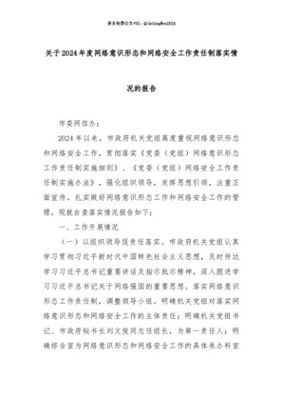 【七哥公文】2024年:关于2024年度网络意识形态和网络安全工作责任制落实情况的报告+更多免费公文+VX:QiGeGongWen2024