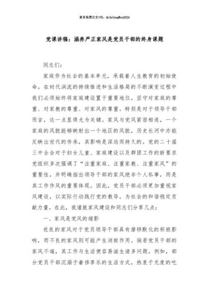 / 【七哥公文】2024年:党课讲稿:涵养严正家风是党员干部的终身课题+更多免费公文+VX:QiGeGongWen2024