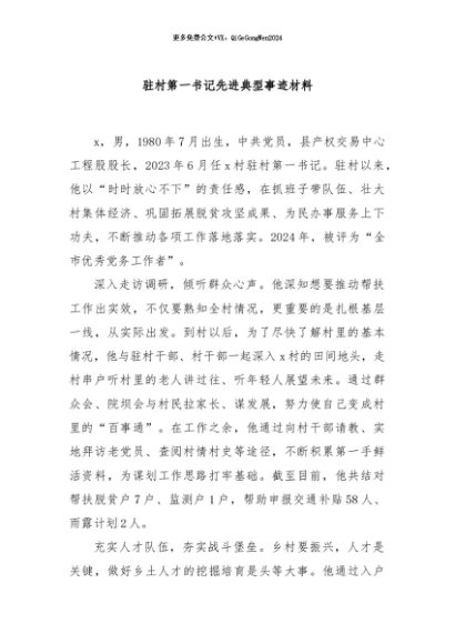 / 【七哥公文】2024年:驻村第一书记先进典型事迹材料+更多免费公文+VX:QiGeGongWen2024